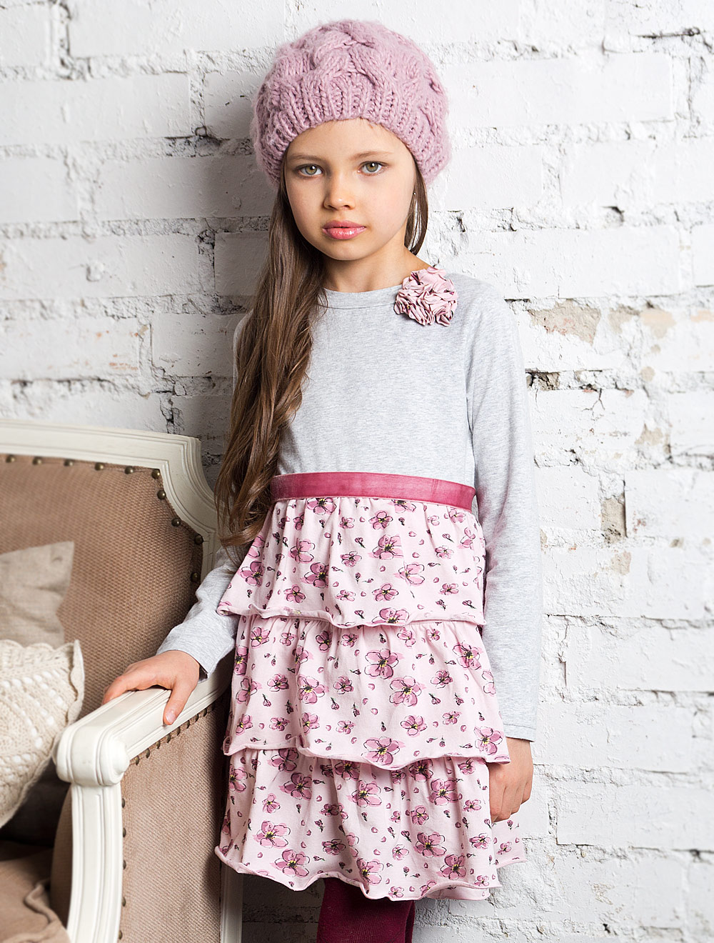 Описание: Платье из хлопкового трикотажа. Декоративный цветок и воланы выполнены из трикотажа с принтом. Талия украшена эластичной бархатной лентой.