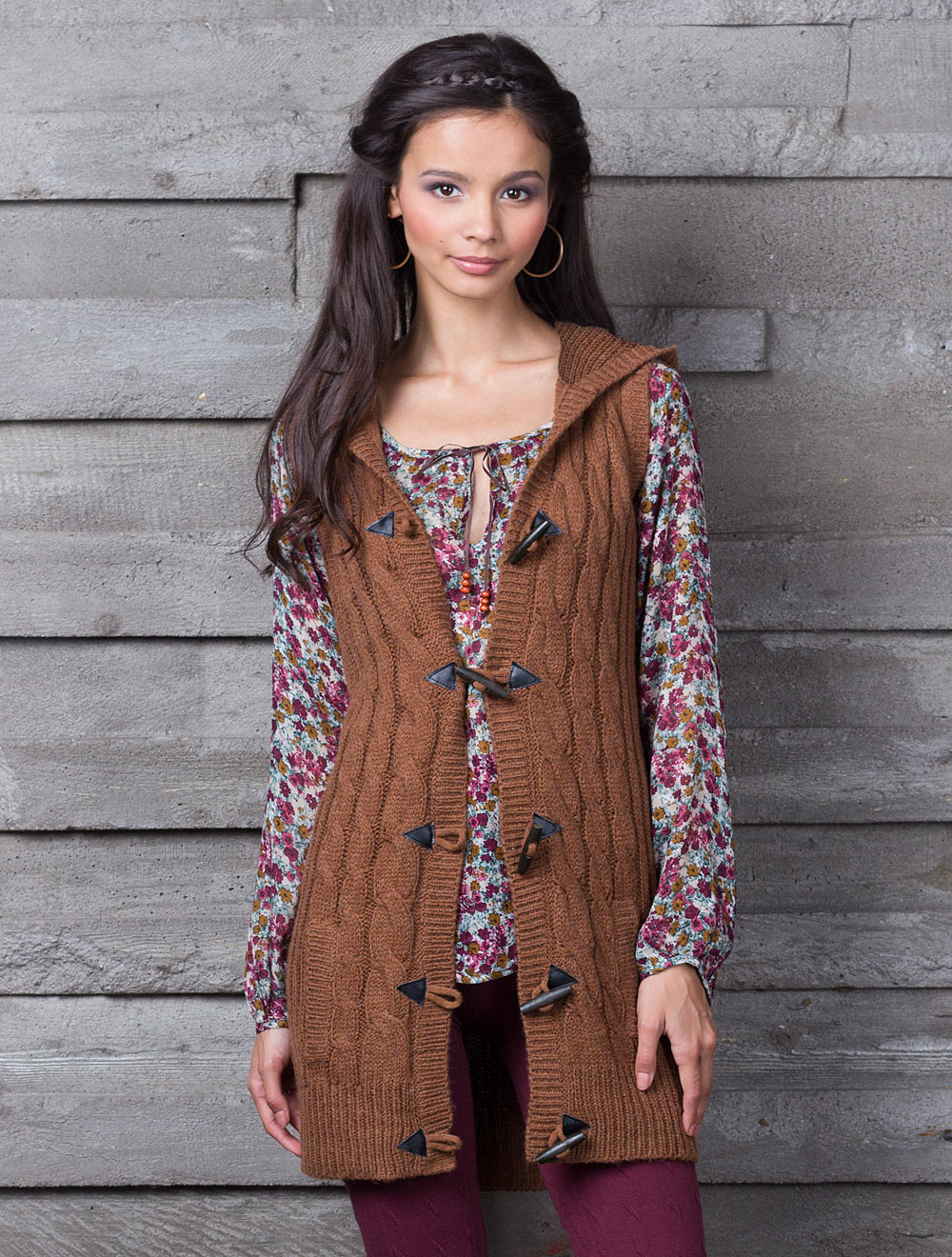 Описание: Передняя часть выполнена вязкой "косы", застежка на крупные деревянные цилиндрические пуговицы