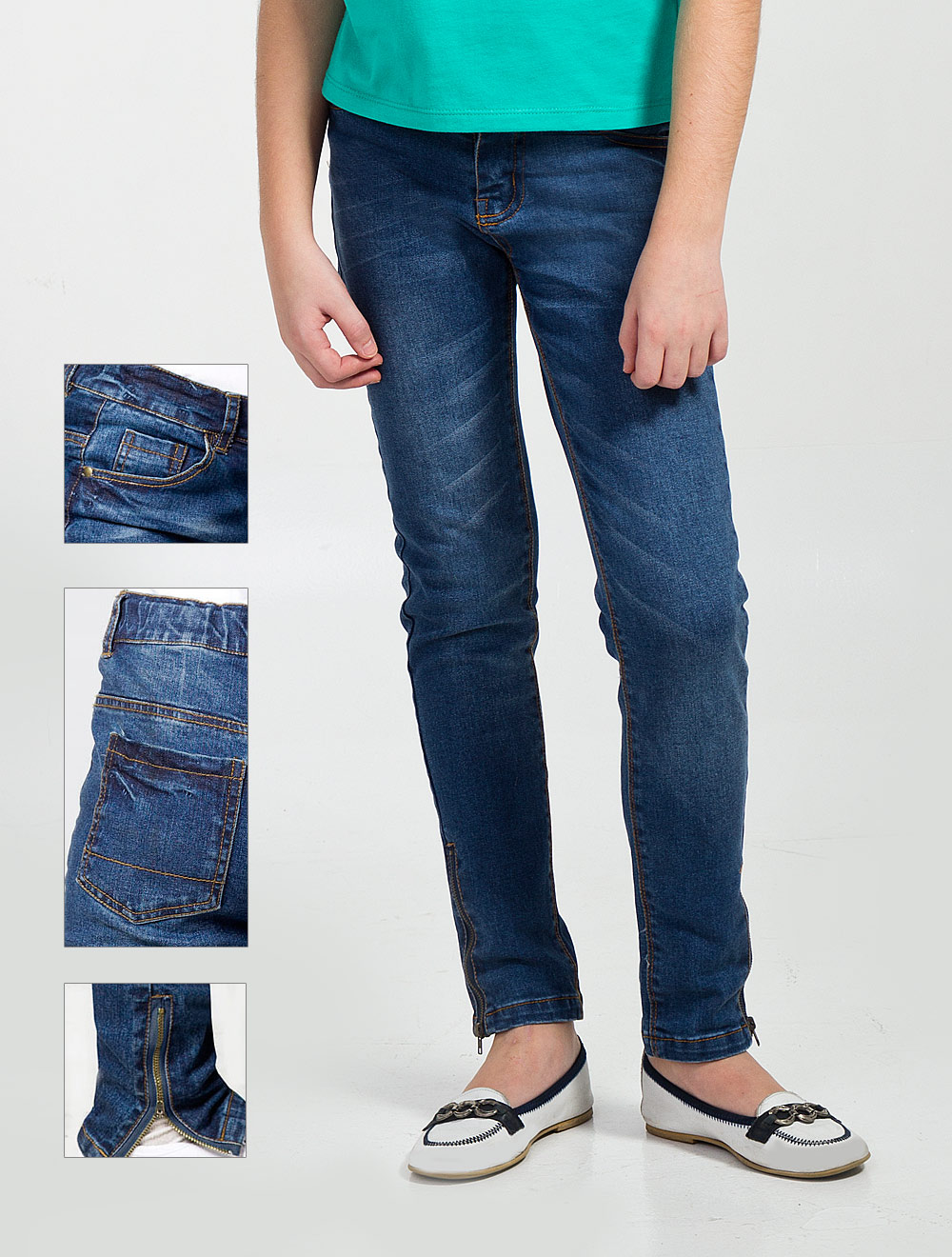 Описание: Эластичная джинсовая ткань. По низу боковых швов - металлические молнии.