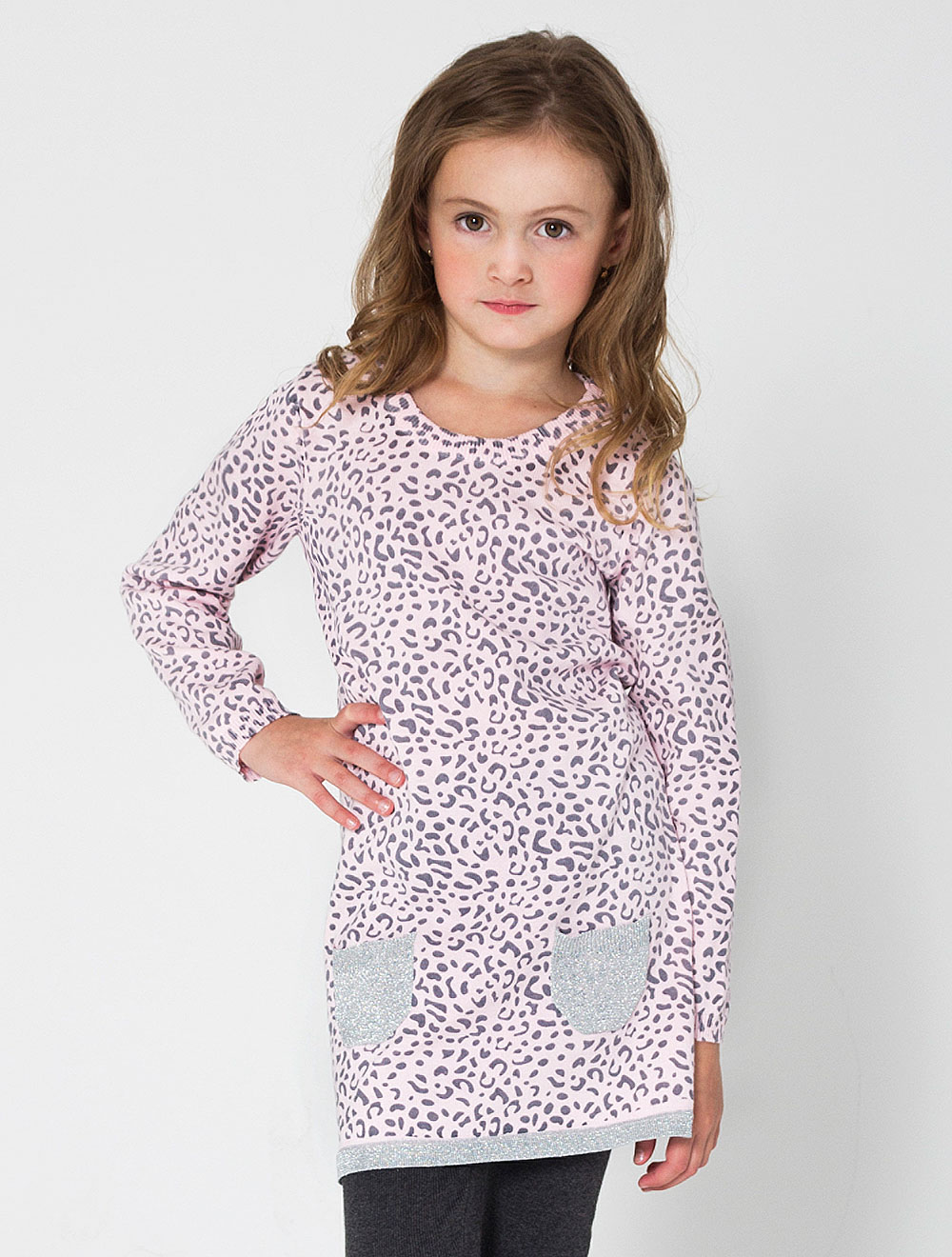 Описание: Платье из принтованного трикотажа. Карманы и отделка низа изделия выполнены из пряжи с люрексом.