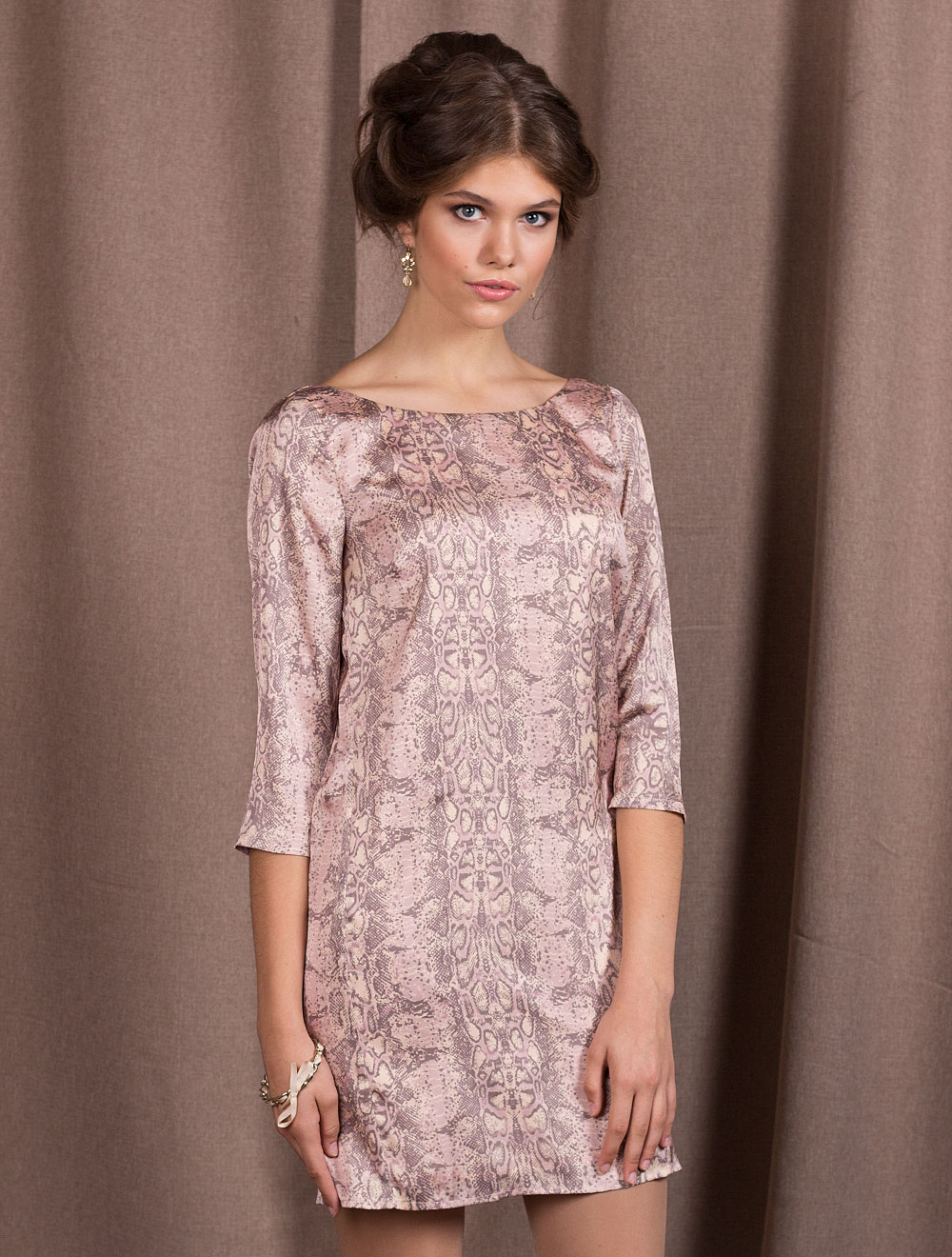 Описание: Полуматовый атлас с принтом под рисунок питона в нежных пастельных тонах. Прямой силуэт с эффекнтным вырезом на спинке. Длина в больших размерах по колено. Платье на подкладке из тонкого атласного трикотажа.В 52 размере платье длинее на 8 см