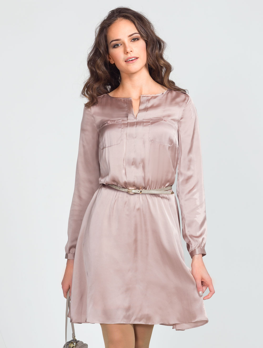 Описание: Полуматовый атлас. Силуэт платья в стиле сафари: легкая свобода облегания в верхей части, погоны и накладные карманы с пуговицами из натурального перламутра. Линия талии собрана на узкую резинку. Юбка свободная с расширением книзу. Длина за колено. Платье на подкладке из тонкого атласного трикотажа. В больших размерах длина за колено