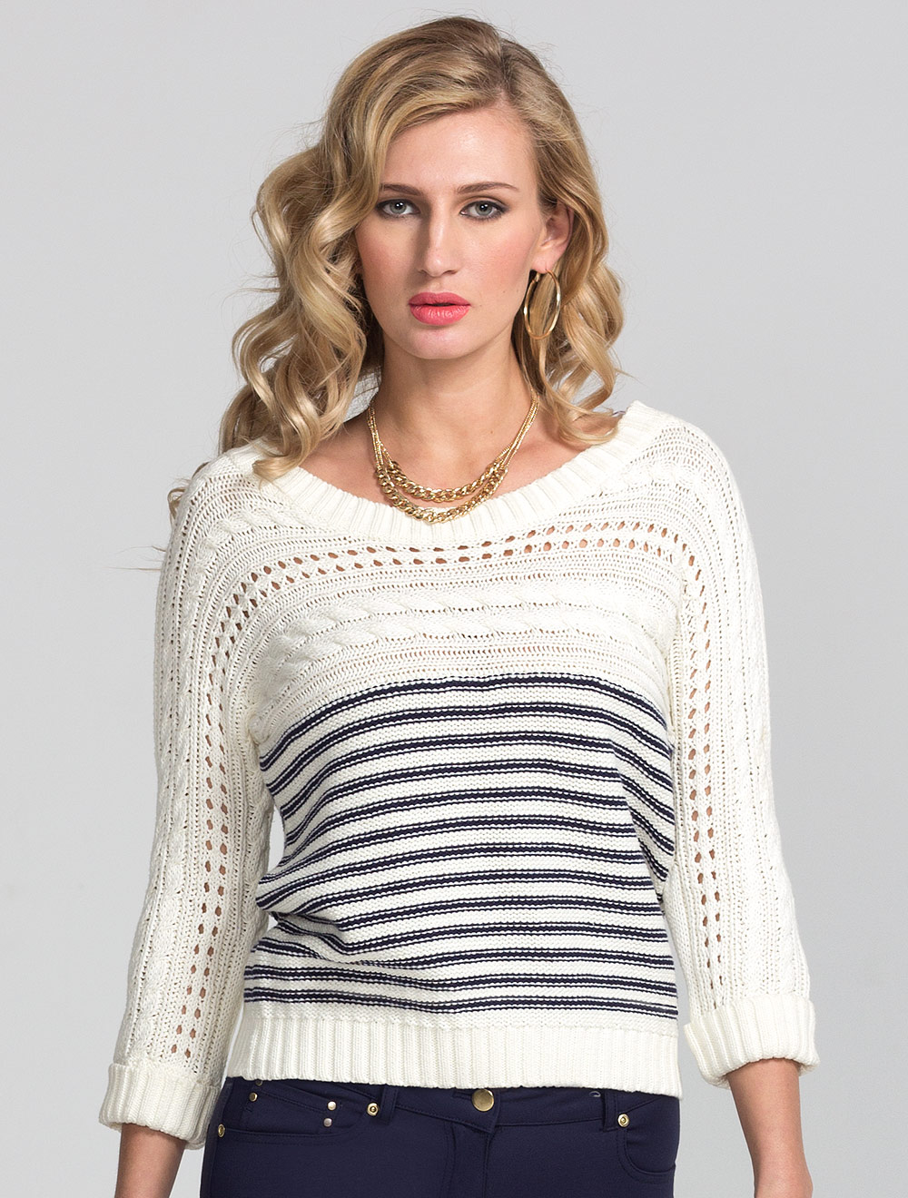 Описание: Крупная и несколько свободная вязка из хлопковой пряжи. Цельнокроеный рукав длиной 3/4. Полосы выглядят особенно эффектно за счет вязки изнанкой на лицевую сторону.
