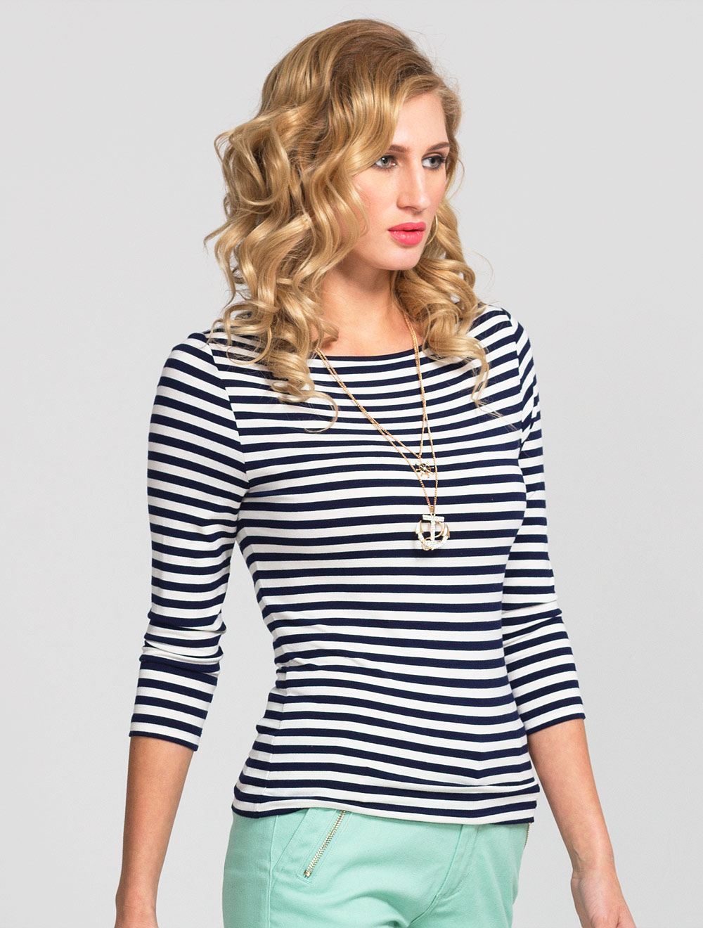 Описание: Эластичная трикотажная вискоза. Приталенный силуэт, вырез горловины по форме "лодочка" с синей окантовкой. Рукав 3/4.