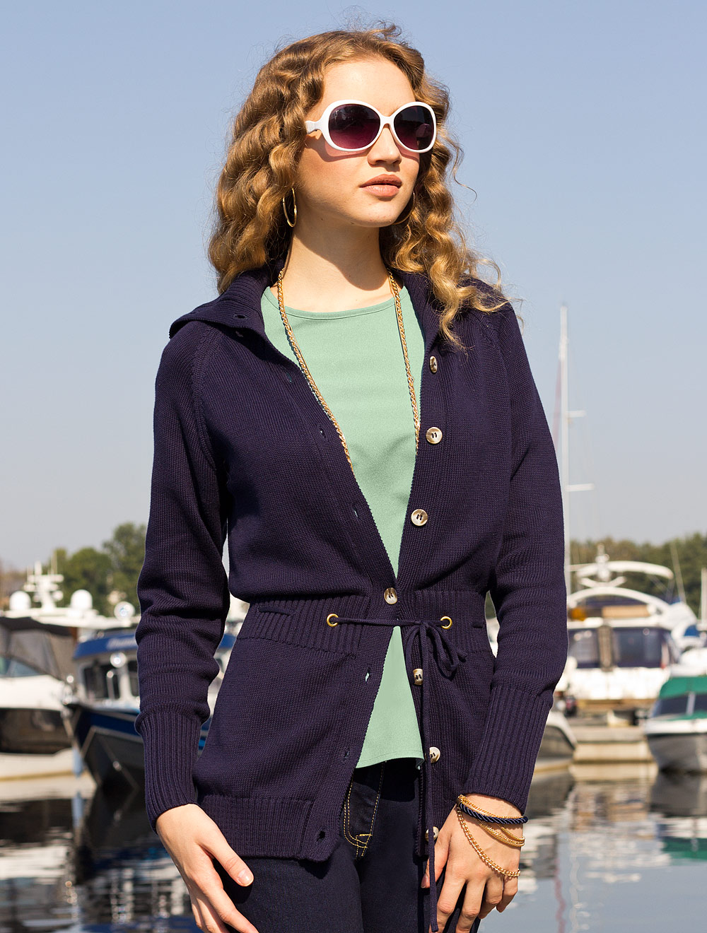 Описание: Плотная хлопковая вязка, застежка на пуговицы серо-белого цвета "под орех", тонкий пояс на талии из основной пряжи, золотистые люверсы
