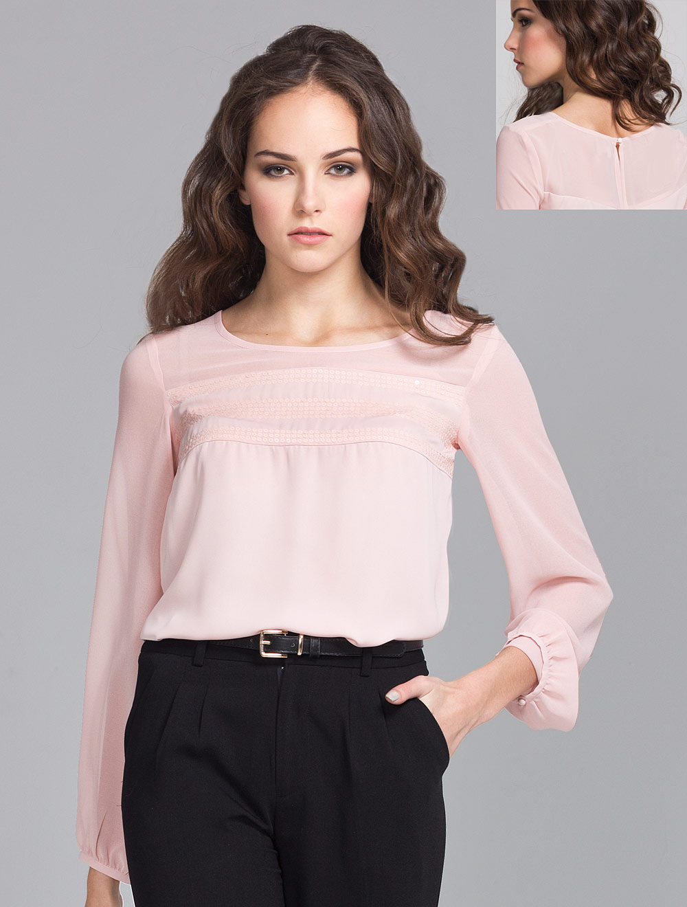 Описание: Блузка из двух тканей: верх и рукава - из шифона, низ - из непрозрачного полиэстера, передняя часть декорирована полосками из розовых пайеток
