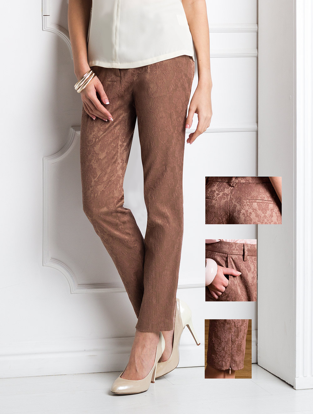 Описание: Эластичная ткань жаккард. По внутреннему шву внизу брюк вшиты потайные молнии