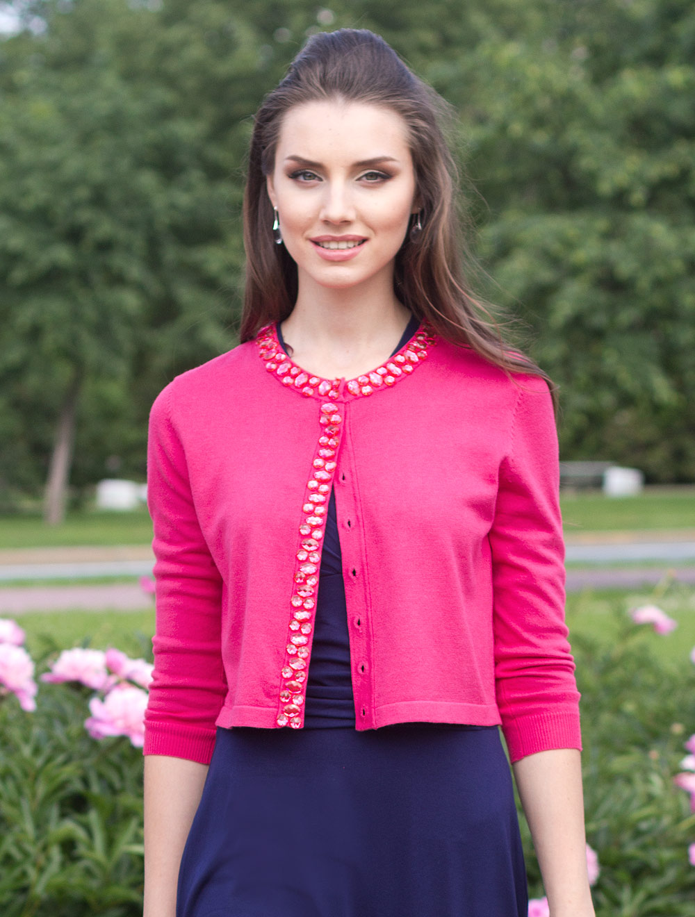 Описание: Тонкая эластичная вязка. Горловина и борт потайной застежки украшены крупными пришивными камнями в тон изделия.