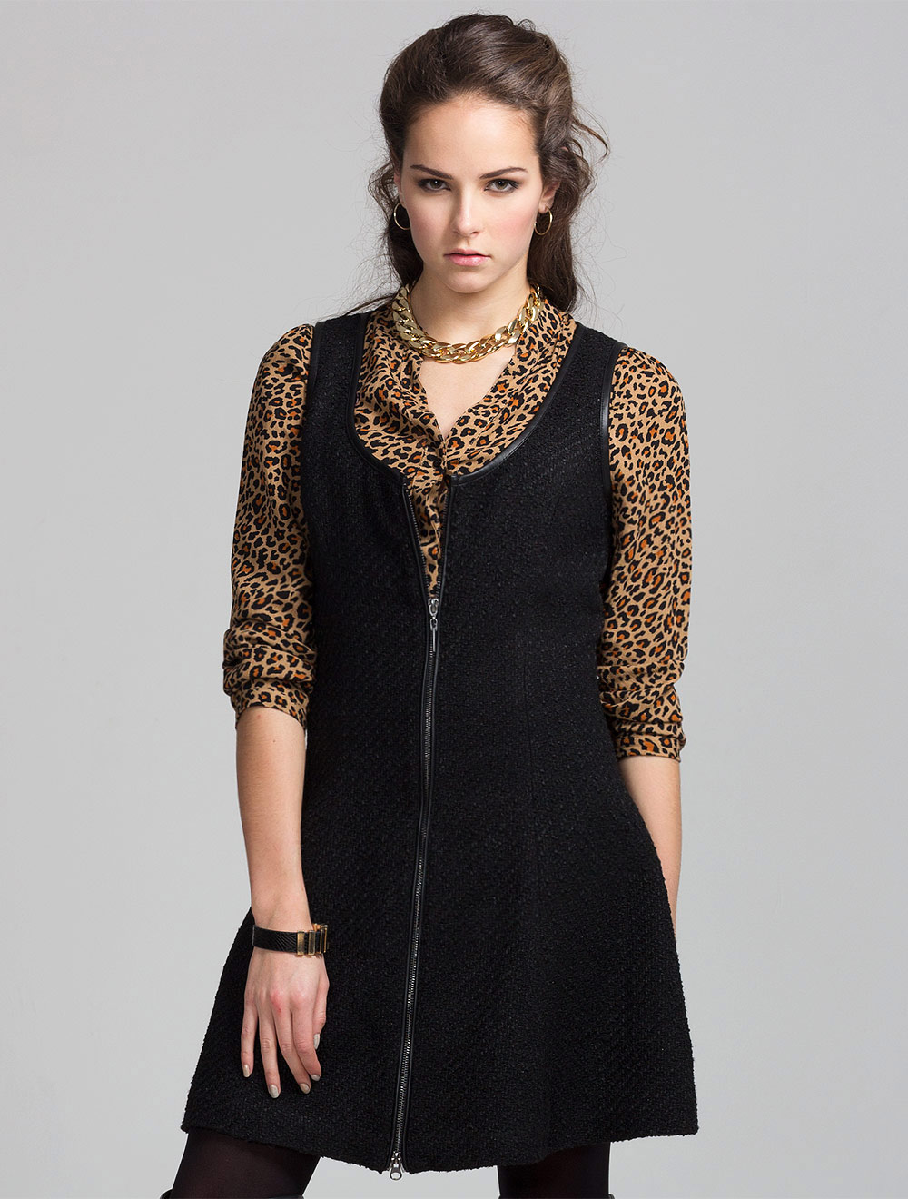 Описание: Жакетная и плотная ткань в стиле "шанель" с небольшими вкраплениями черного люрекса. Проймы и горловины окантованы иск кожей, застежка спереди на двусторонюю металлическую молнию блестящего т. серебряного цвета. В больших размерах длина за колено