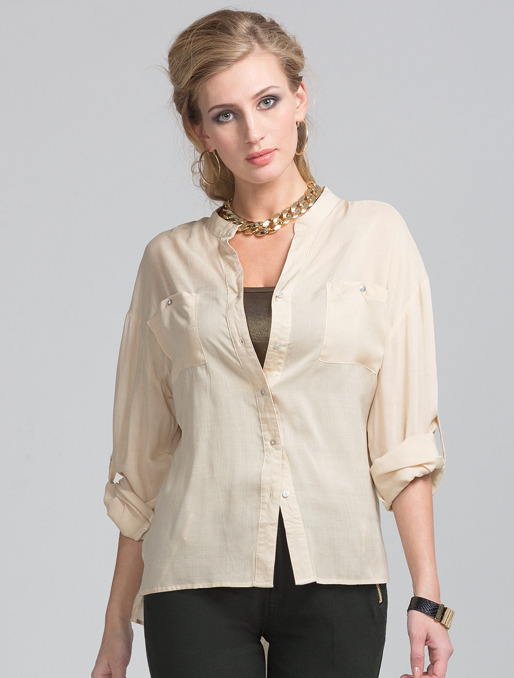 Описание: Тончайшее вискозное полотно "вуаль". Свободный силуэт классической блузки "сафари", накладные передние карманы, отвороты рукава закрепляются на паты, эффектное оформление спинки кокеткой с защипами. Пуговицы из натурального ракушечника.