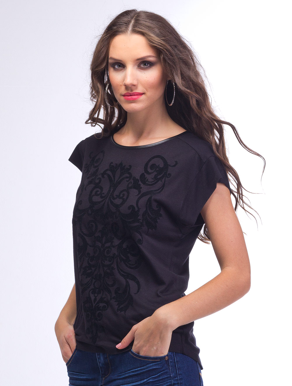 Описание: Вискозный трикотаж. Перед украшен бархатным узором (флок). Горловина окантована тонкой иск. кожей. На спинке металлическая молния золотистого цвета.