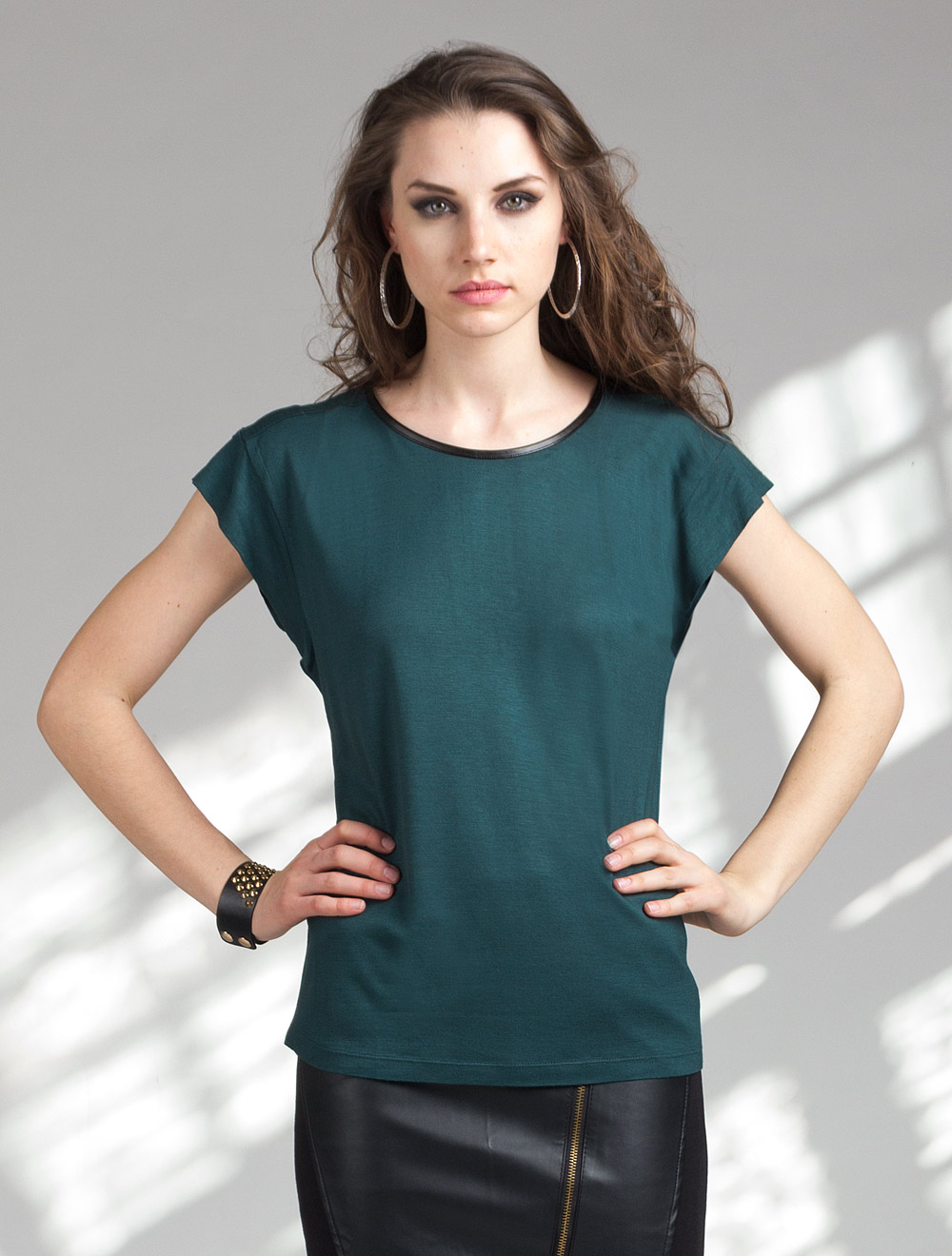 Описание: Тонкий вискозный трикотаж. Рукава в широких проймах выполнены в виде двуслойных широких манжет. Горловина окантована тонкой иск. кожей. Спинка украшена металлической молнией с кожаной подвеской.