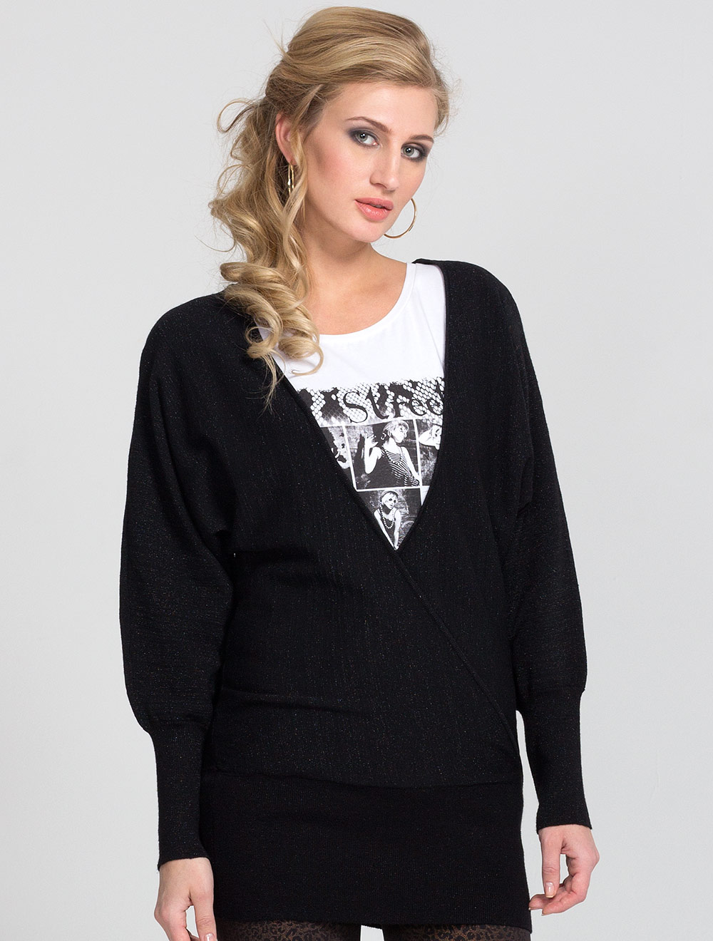 Описание: Джемпер с эффектом запаха. В пряже присутствует люрекс, что создает эффект мерцания.