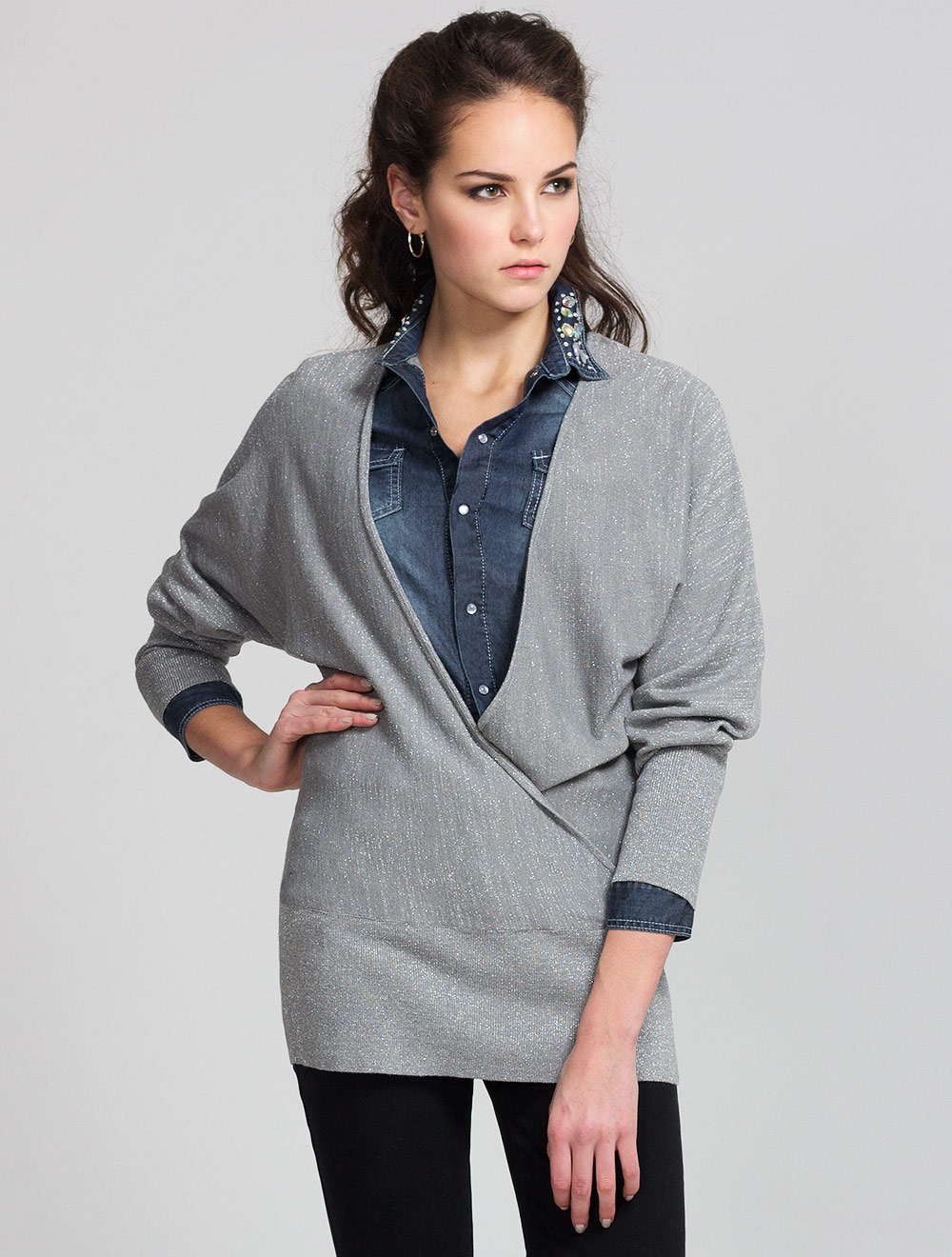 Описание: Джемпер с эффектом запаха. В пряже присутствует люрекс, что создает эффект мерцания.