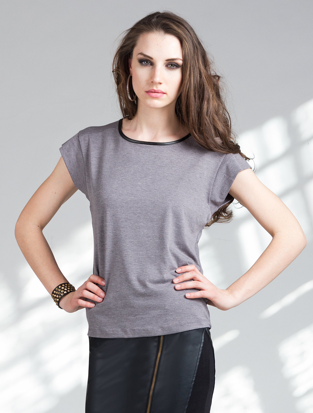 Описание: Тонкий вискозный трикотаж. Рукава в широких проймах выполнены в виде двуслойных широких манжет. Горловина окантована тонкой иск. кожей. Спинка украшена металлической молнией с кожаной подвеской.