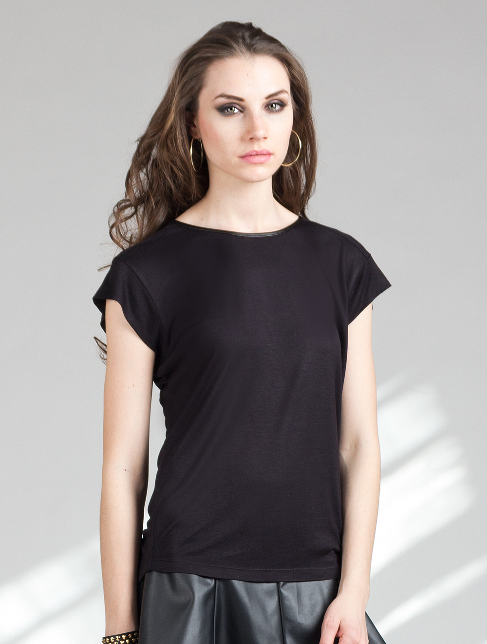Описание: Тонкий вискозный трикотаж. Рукава в широких проймах выполнены в виде двуслойных широких манжет. Горловина окантована тонкой иск. кожей. Спинка украшена металлической молнией с кожаной подвеской.