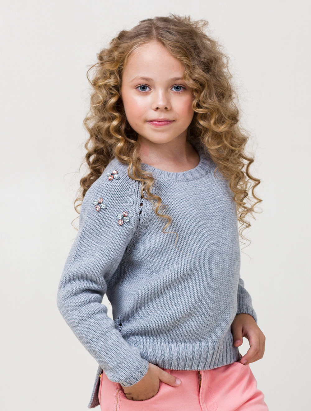 Описание: Джемпер из мягкой хлопковой пряжи со стразами на плечах. По бокам разрезы, перед короче спинки.