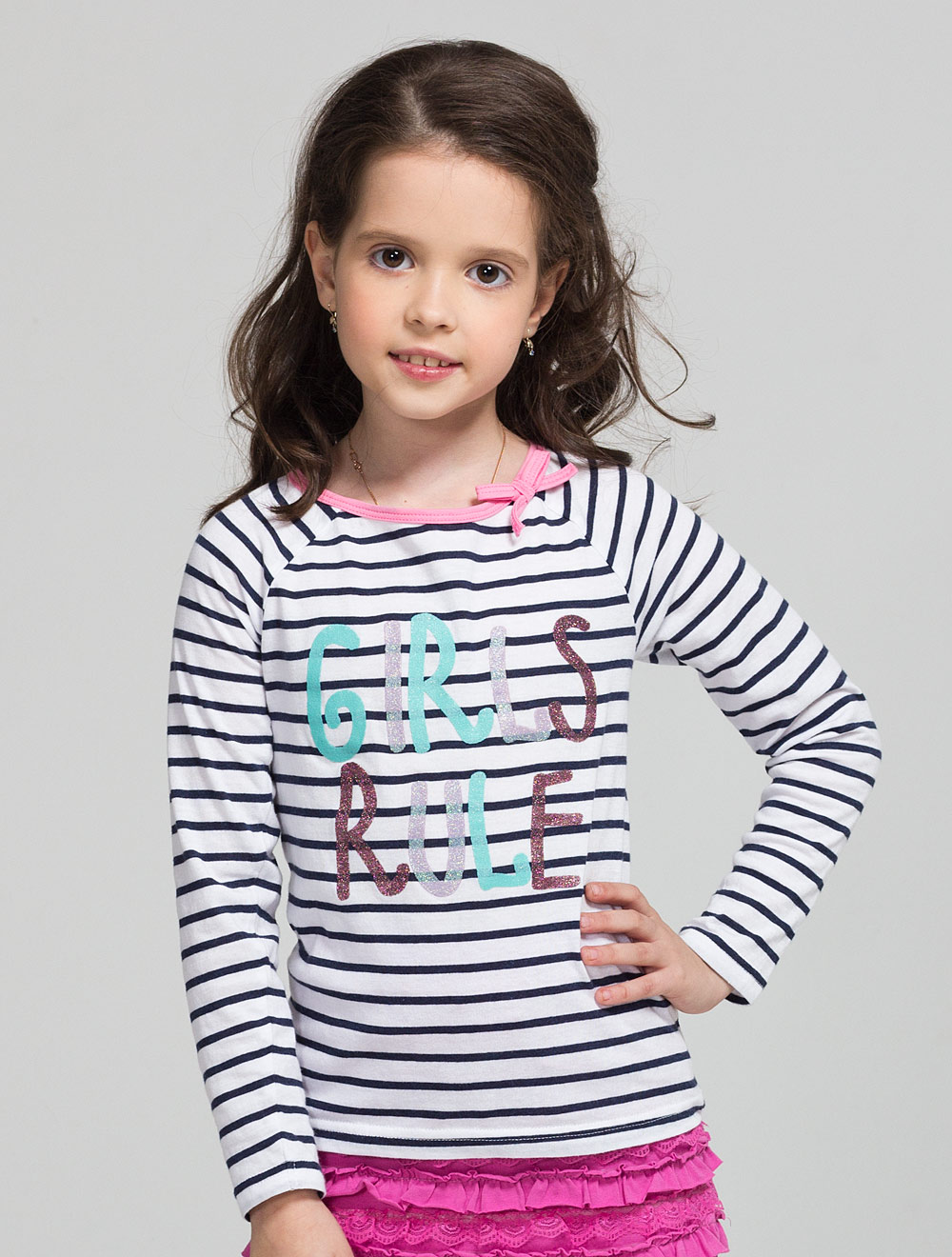 Описание: Футболка из тонкого хлопкового трикотажного полотна, декорированная принтом.Широкую горловину, окантованную бейкой, украшает бантик.