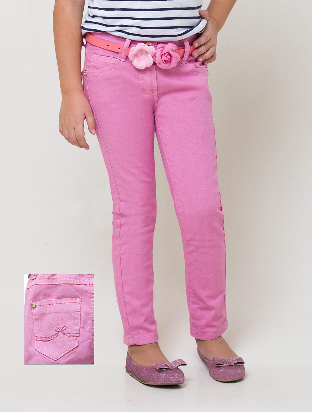 Описание: Брюки из хлопковой ткани с добавлением эластана. Пояс с декоративными цветами входит в комплект.