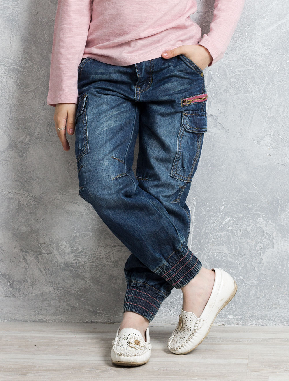 Описание: Джинсы с эффектом стирки, декорированные контрастной строчкой и заклепками.