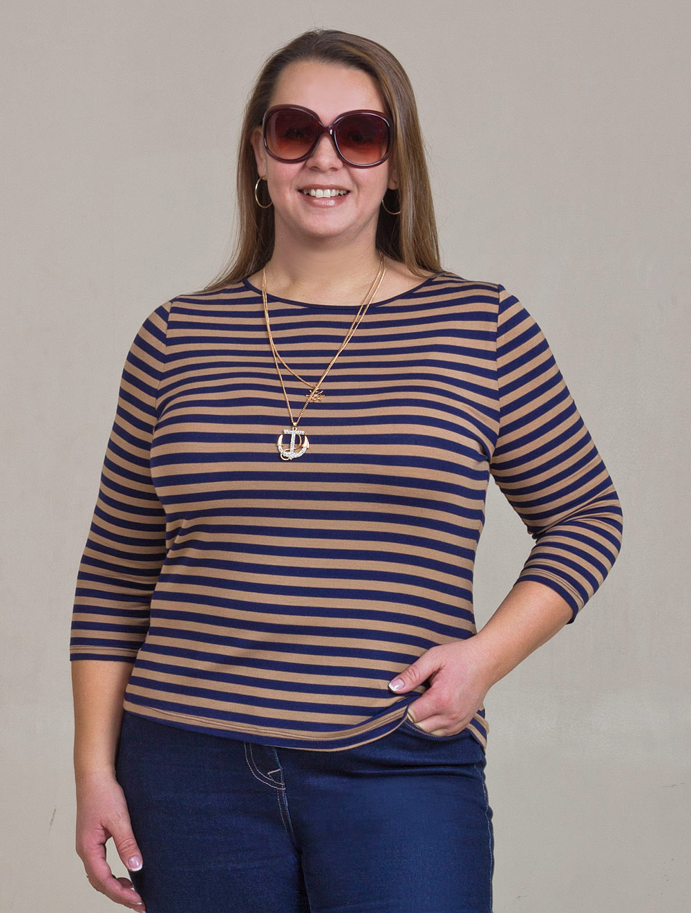 Описание: Эластичная трикотажная вискоза. Приталенный силуэт, вырез горловины по форме "лодочка" с синей окантовкой. Рукав 3/4.