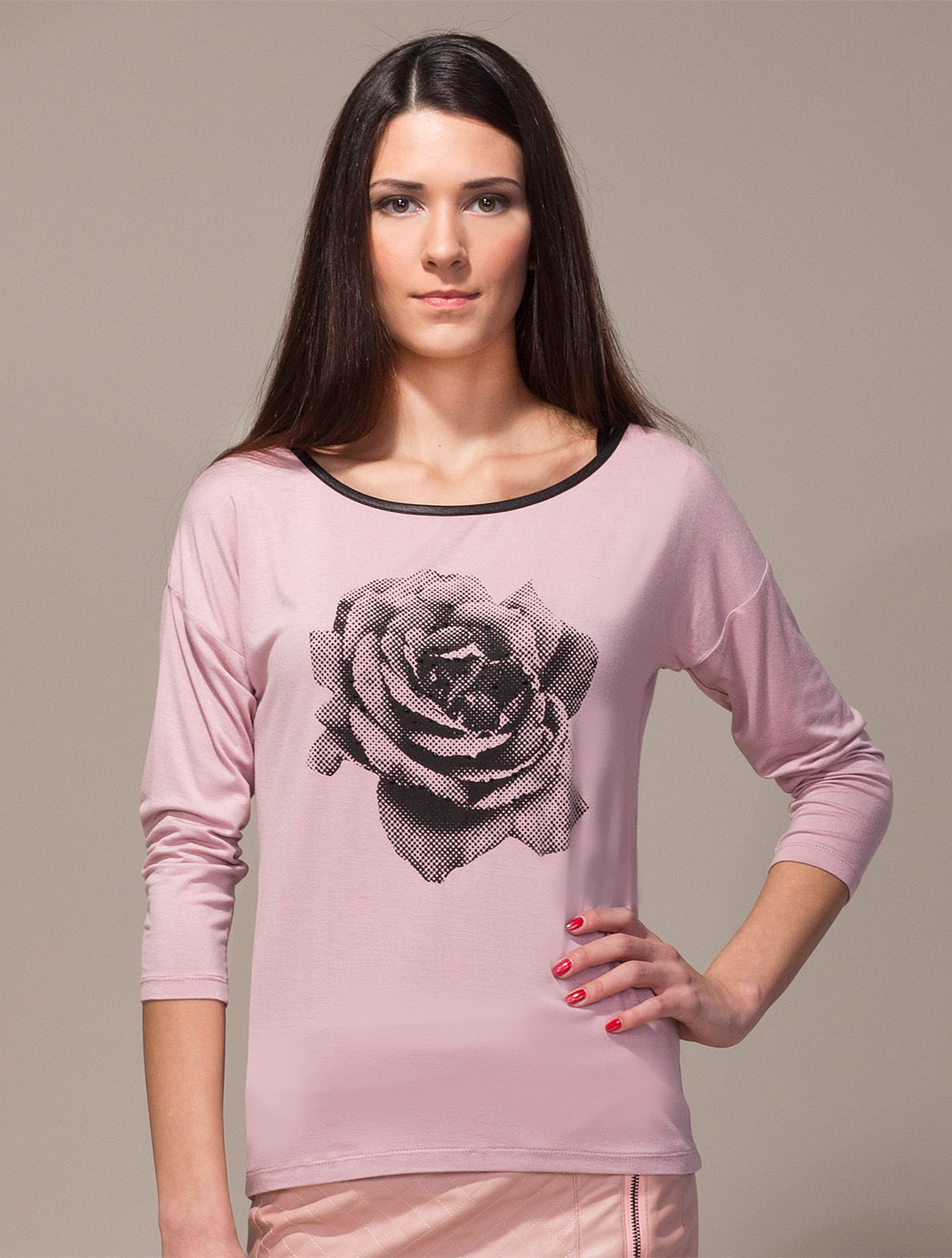 Описание: Тонкая эластичная вискоза. Крой рукава "летучая мышь" со спущенной проймой. Горловина окантована иск кожей. Спереди принт, украшенный стразами.