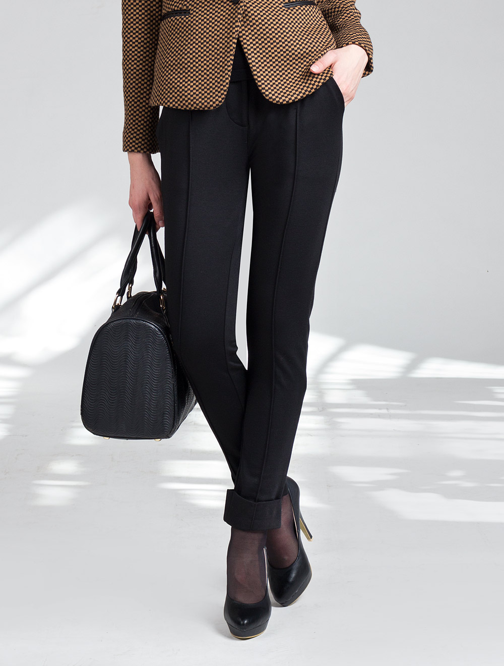 Описание: Выполнены из плотного джерси. По форме классических брюк со стрелкой зауженных к низу с широким манжетом. Имитацию заутюженной стрелки выполняет отделочная отстрочка на 1 мм вдоль передних половинок брюк.