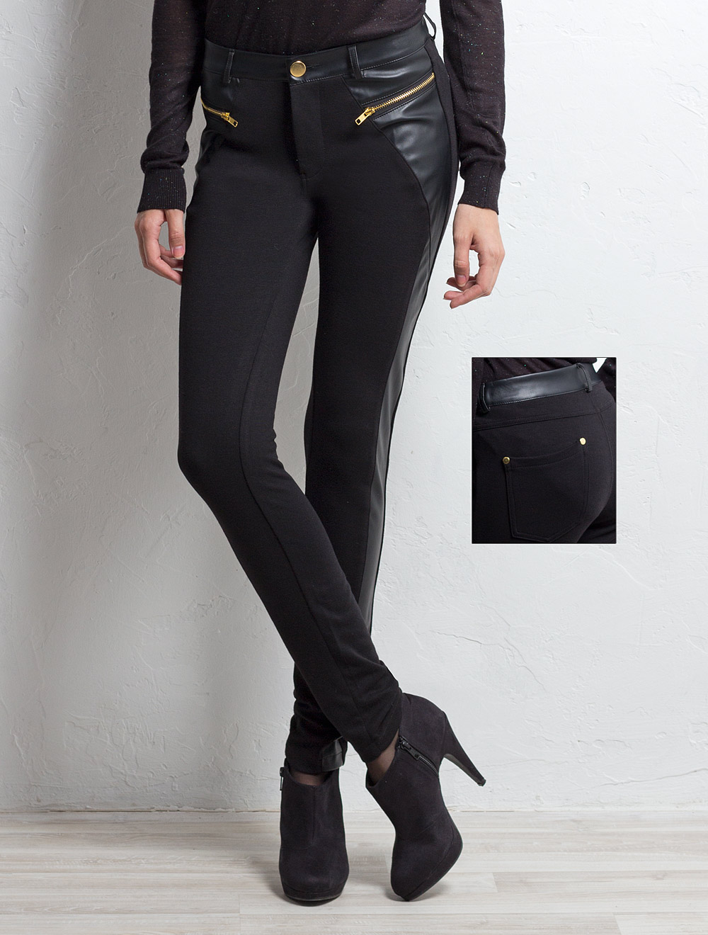 Описание: Выполнены из плотного джерси. Пояс и боковые вставки из эластичной иск. кожи. Брюки заужены к низу и плотно облегают фигуру.