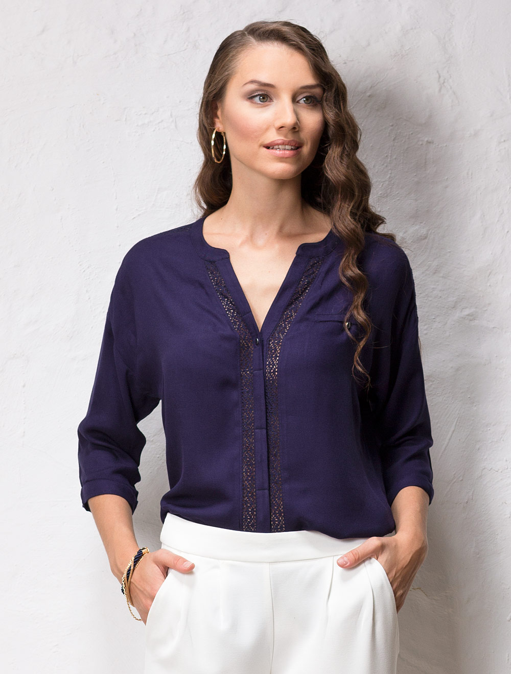 Описание: Вискозная ткань с плетением в рубчик. Рукава 3/4 со спущенной проймой и узкими манжетами. Перед вдоль застежек акцентирован хлопковым кружевом изящного ручного плетения.