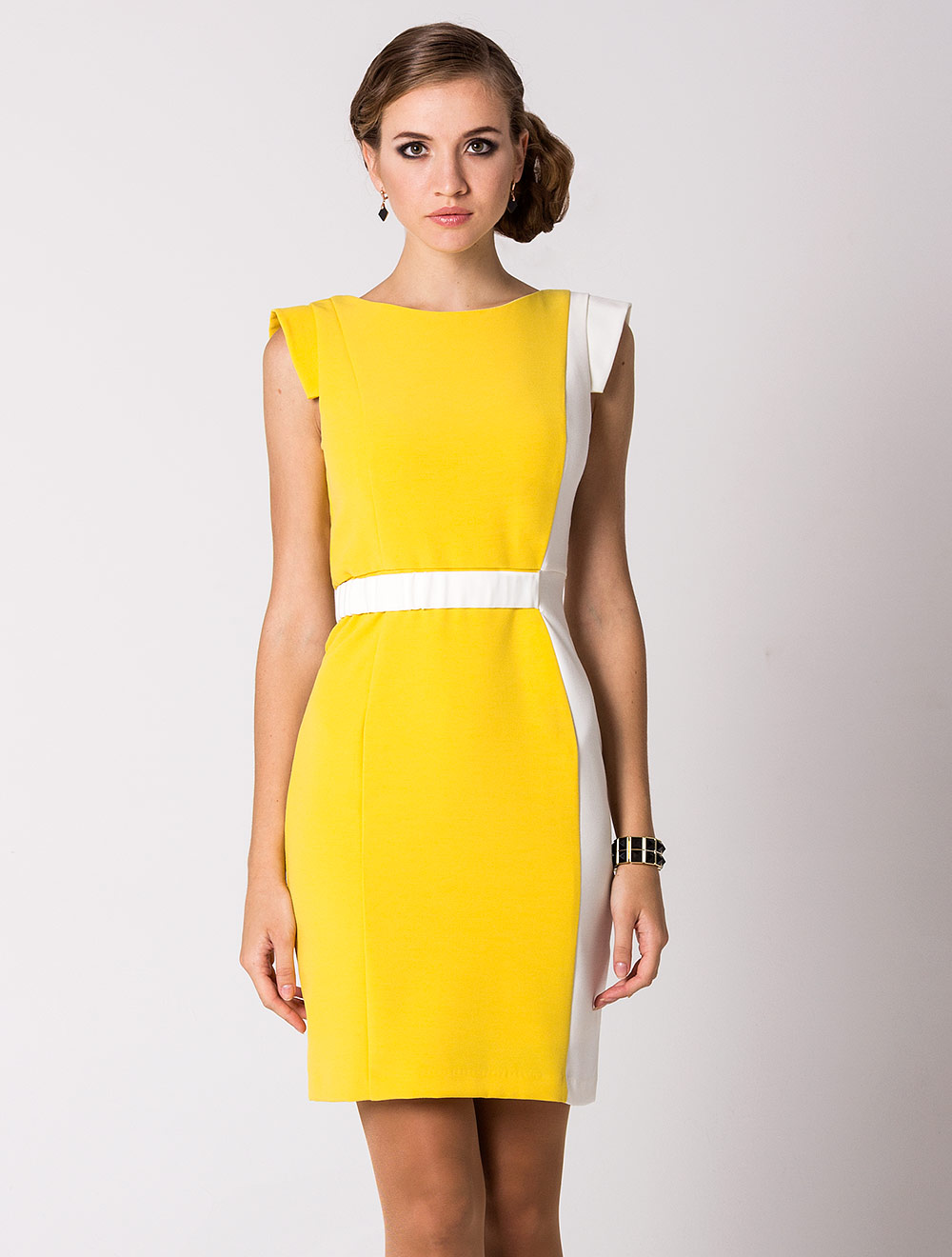 Описание: Формоустойчивая и эластичная ткань средней плотности. Платье приталенного силуэта с ассиметричным кроем двух оттенков ткани. Пояс из белой основной ткани на эластичной тесьме закреплен в швах крепления белых деталей платья. Потайная молния в боковом шве. Платье на подкладке. В больших размерах - по колено.