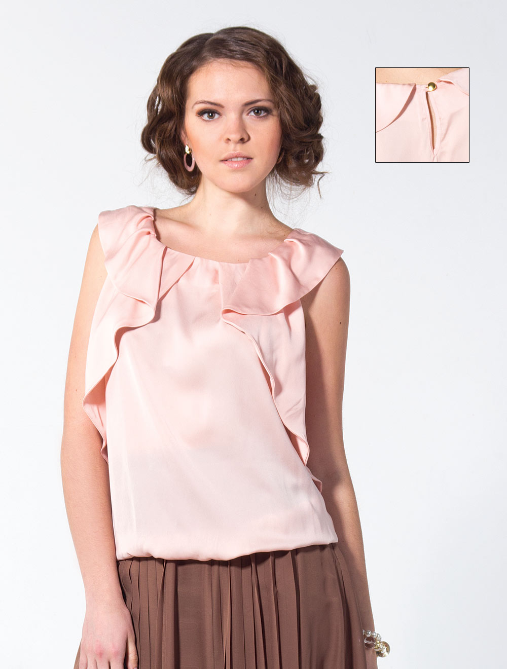 Описание: ткань - тонкий матовый атлас, вырез горловины и рукавов украшен двуслойными воланами, низ топа собран на резинку