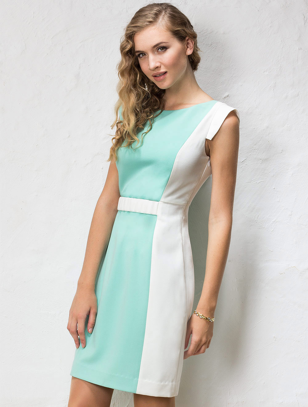 Описание: Формоустойчивая и эластичная ткань средней плотности. Платье приталенного силуэта с ассиметричным кроем двух оттенков ткани. Пояс из белой основной ткани на эластичной тесьме закреплен в швах крепления белых деталей платья. Потайная молния в боковом шве. Платье на подкладке. В больших размерах - по колено.