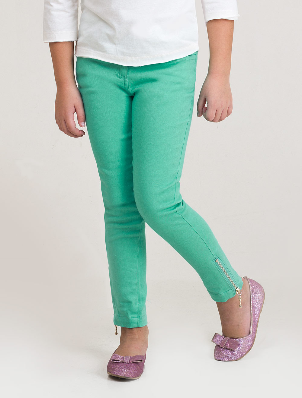 Описание: Узкие брюки для девочки из эластичного хлопка. Ширина талии регулируется внутренней резинкой. Разрезы по бокам обработаны молнией.