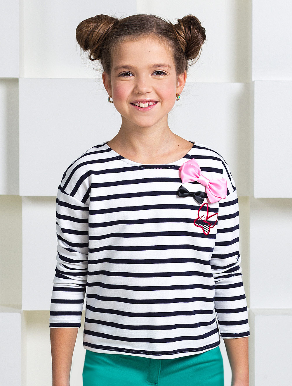 Описание: Футболка из плотного мягкого трикотажного полотна, декорированная вышивкой и бантами.