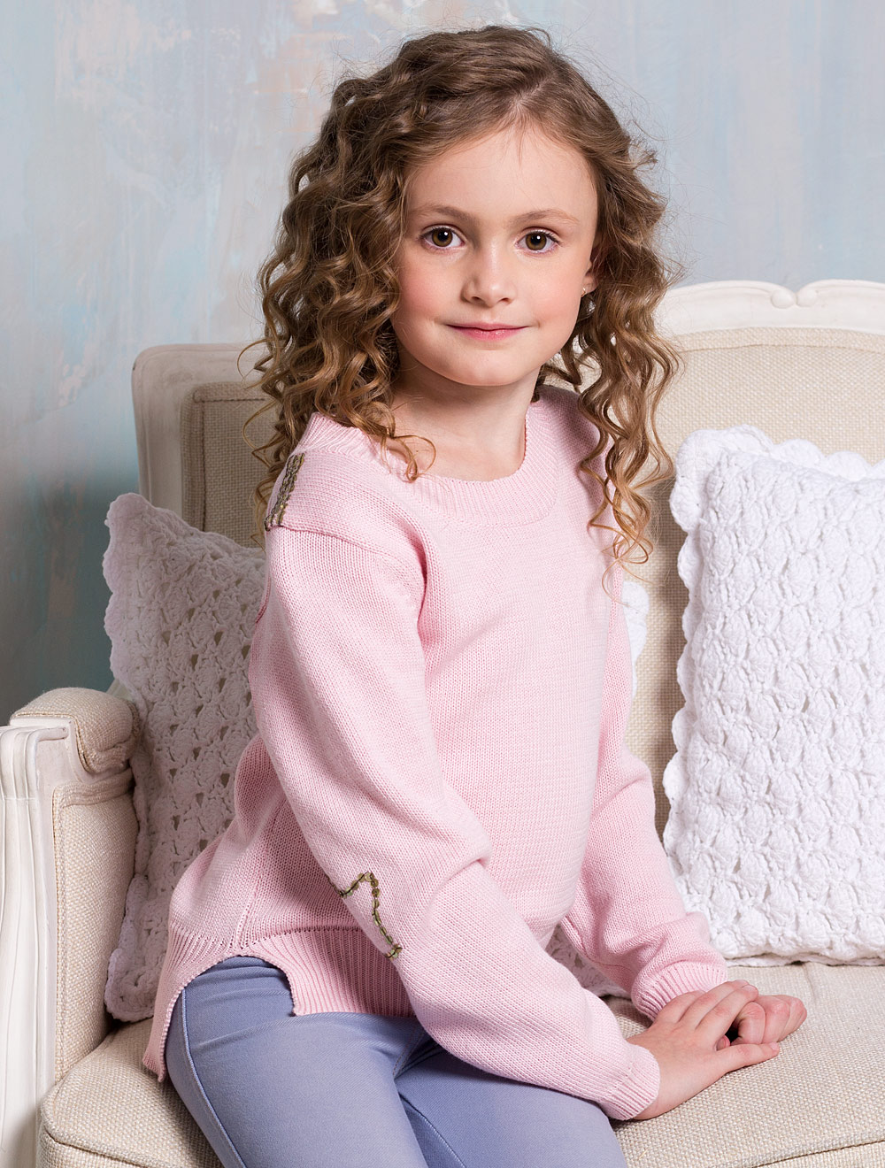 Описание: Вязаный джемпер с боковыми разрезами. Плечи и локти декорированы пайетками.