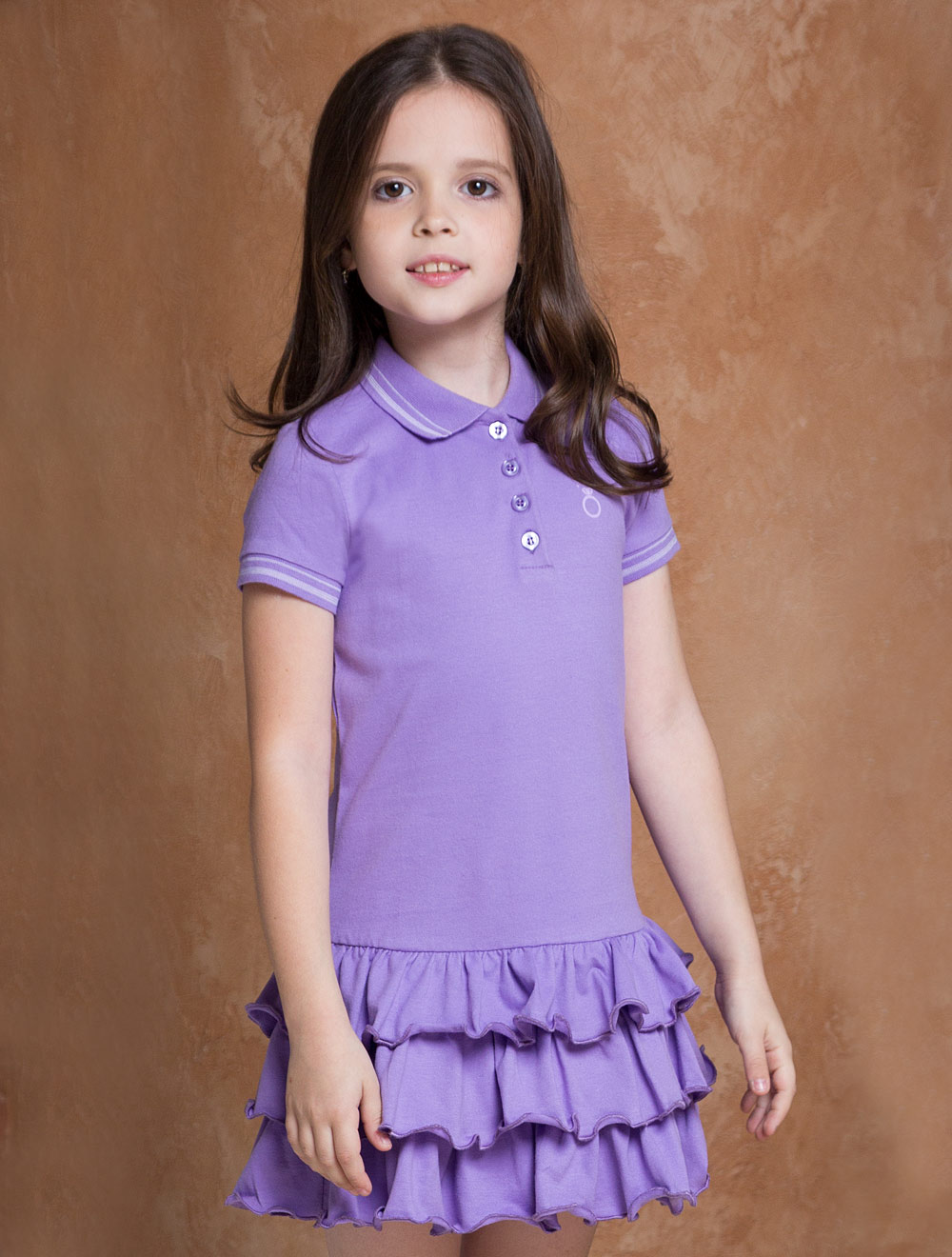 Описание: Платье-поло из ткани пике, с оборками по низу. Воротник и манжеты из трикотажной резинки с полосой контрастного цвета.