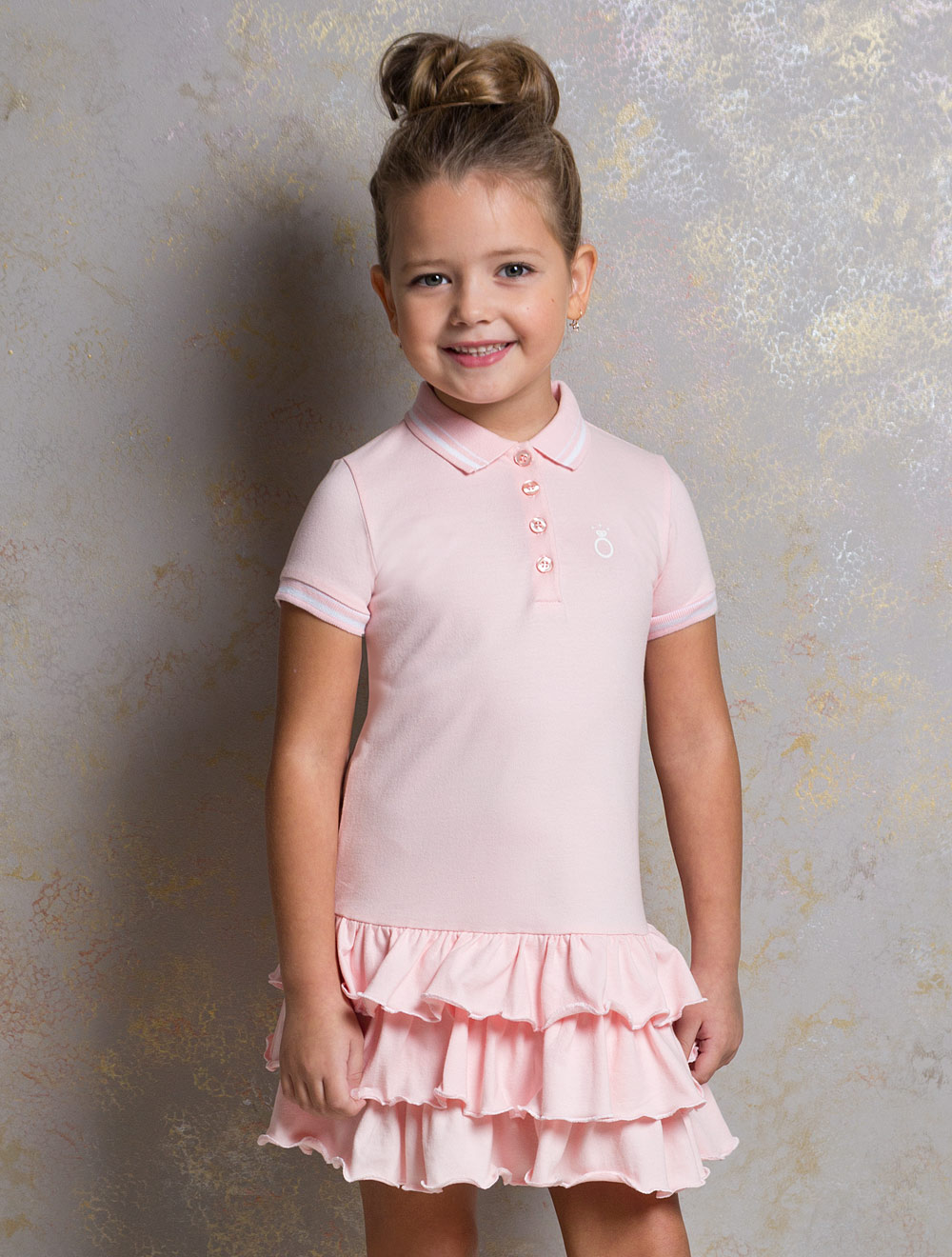 Описание: Платье-поло из ткани пике, с оборками по низу. Воротник и манжеты из трикотажной резинки с полосой контрастного цвета.