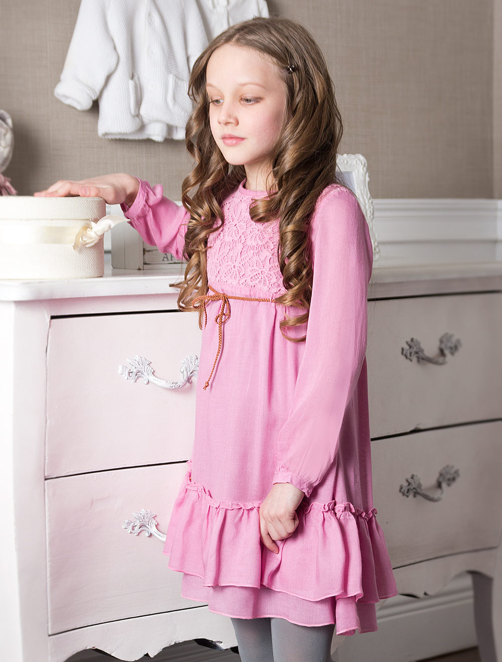 Описание: Платье с завышенной талией, декорированное кружевом и тонким поясом из искусственной кожи.