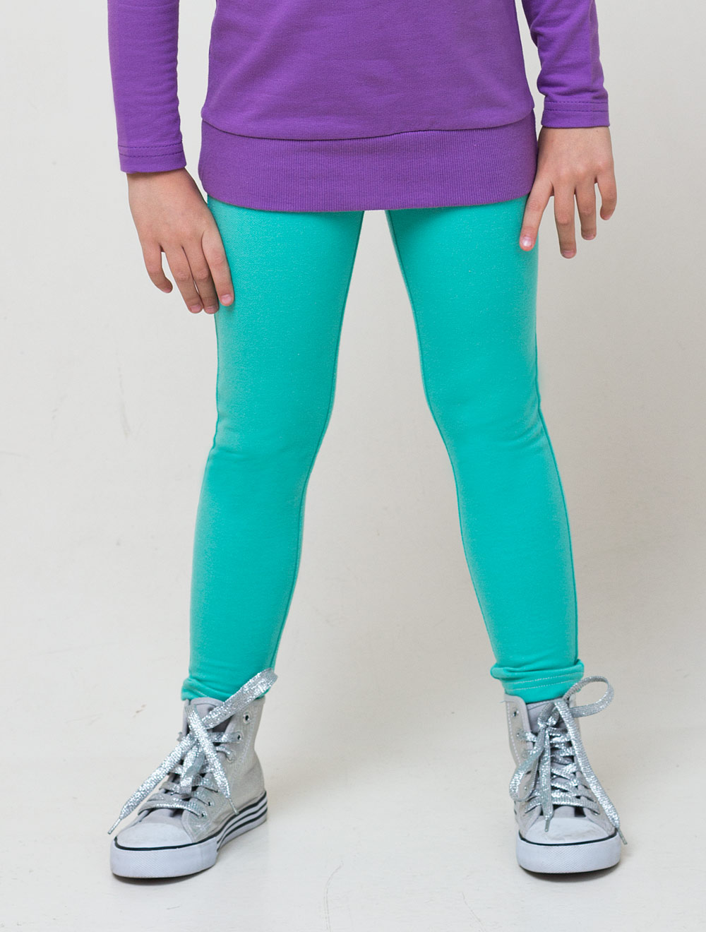 Описание: Брюки для девочек из эластичного трикотажного полотна. Декоративные отстрочки "под джинсы" спереди и сзади. Пояс на резинке. Задние накладные карманы.