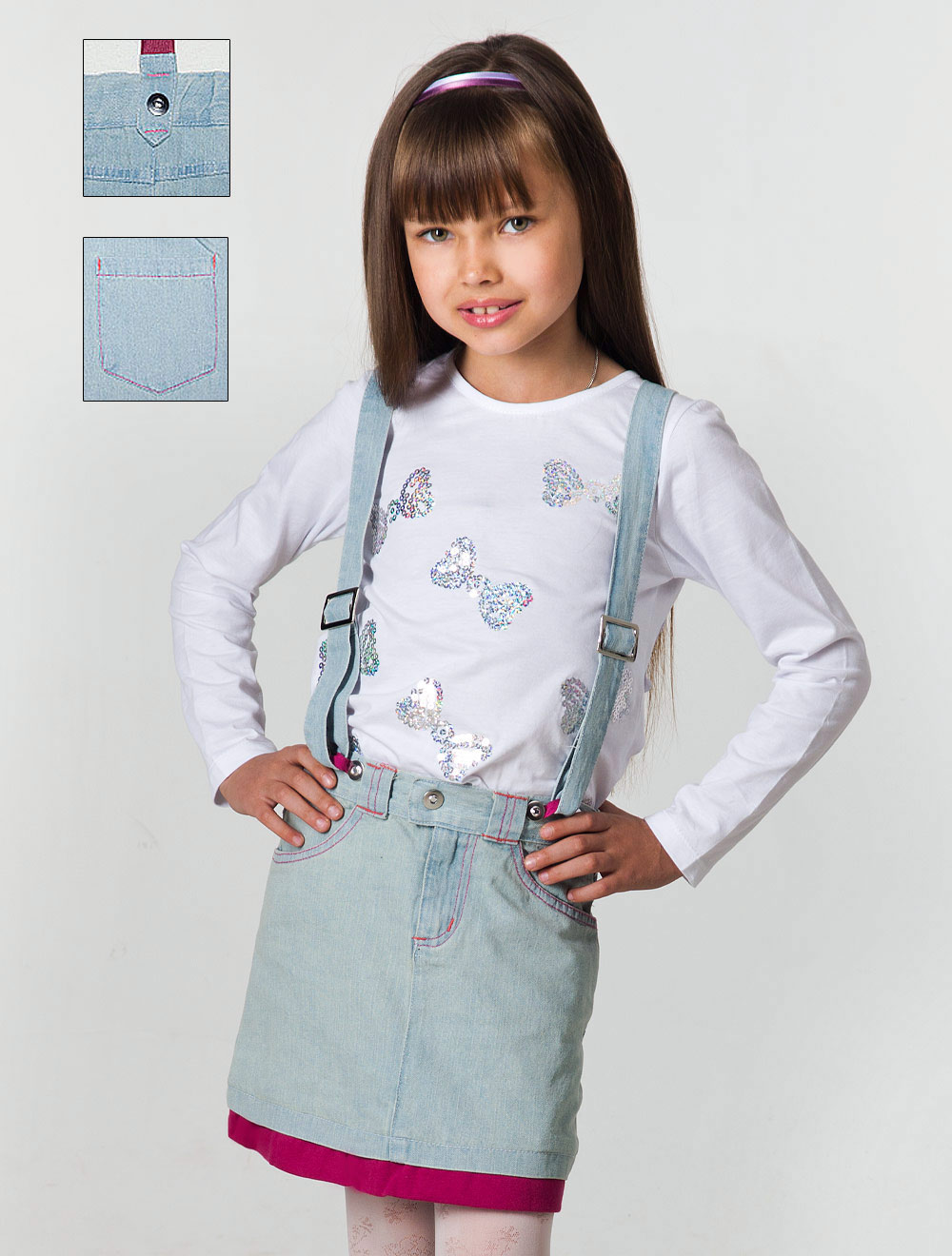 Описание: Джинсовая юбка с подтяжками, регулирующимися по длине, и контрастной полосой по низу. Ширина талии регулируется резинкой. Все отстрочки контрастного цвета.