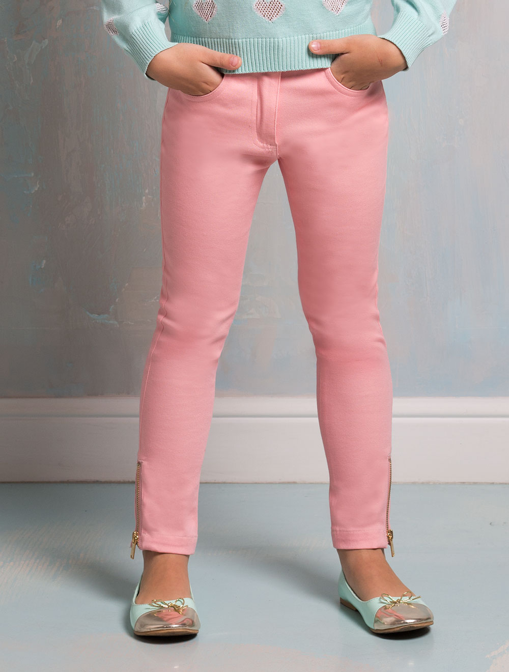 Описание: Узкие брюки для девочки из эластичного хлопка. Ширина талии регулируется внутренней резинкой. Разрезы по бокам обработаны молнией.