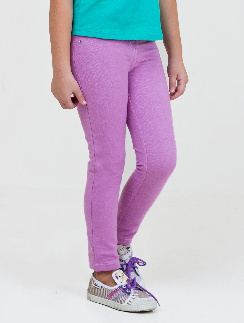 Описание: Брюки для девочек из эластичного трикотажного полотна. Декоративные отстрочки "под джинсы" спереди и сзади. Пояс на резинке. Задние накладные карманы.