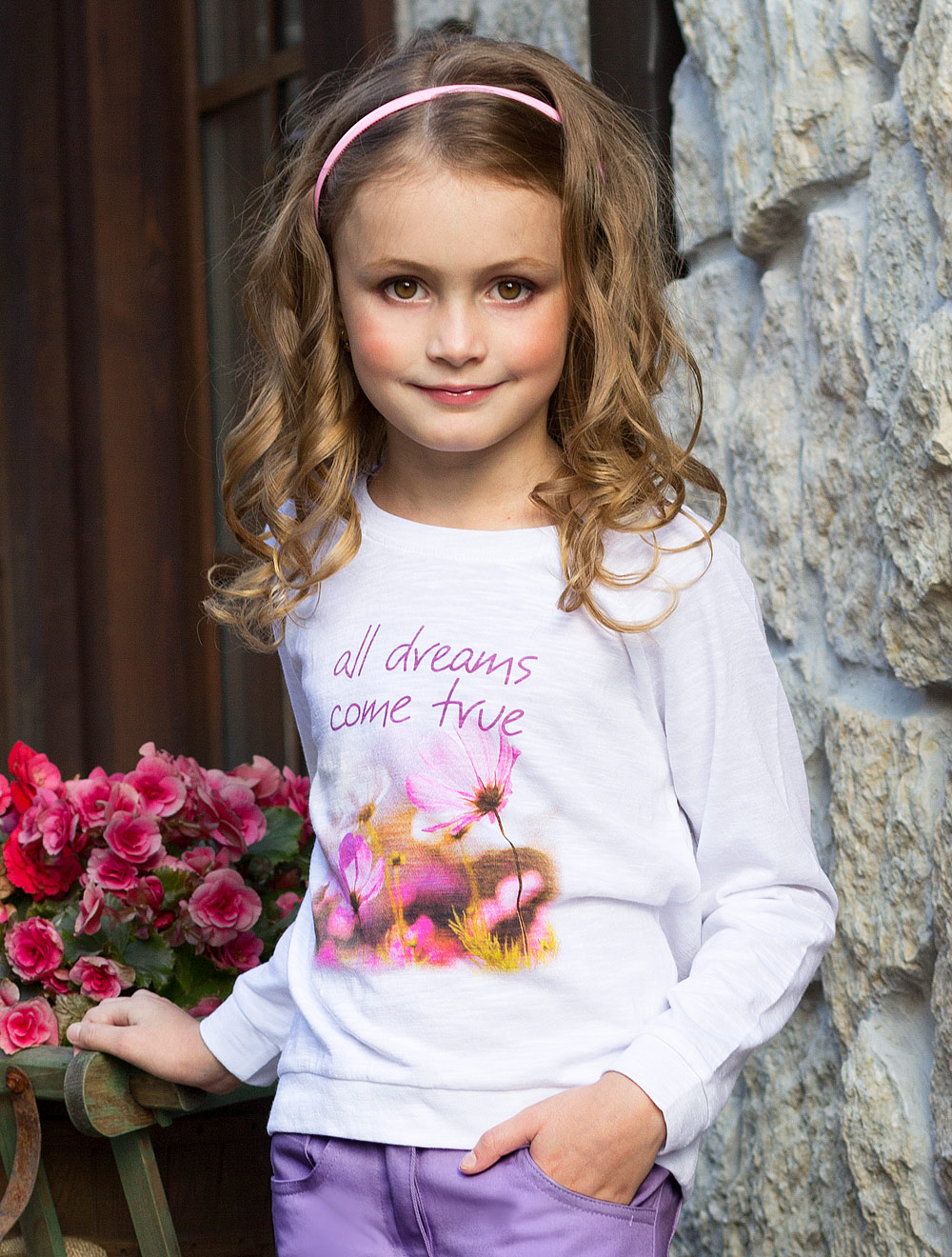 Описание: Свободная футболка для девочки с рукавами покроя реглан. Манжеты и обтачка горловины из основного материала. Перед слегка короче спинки за счет фигурной линии низа.