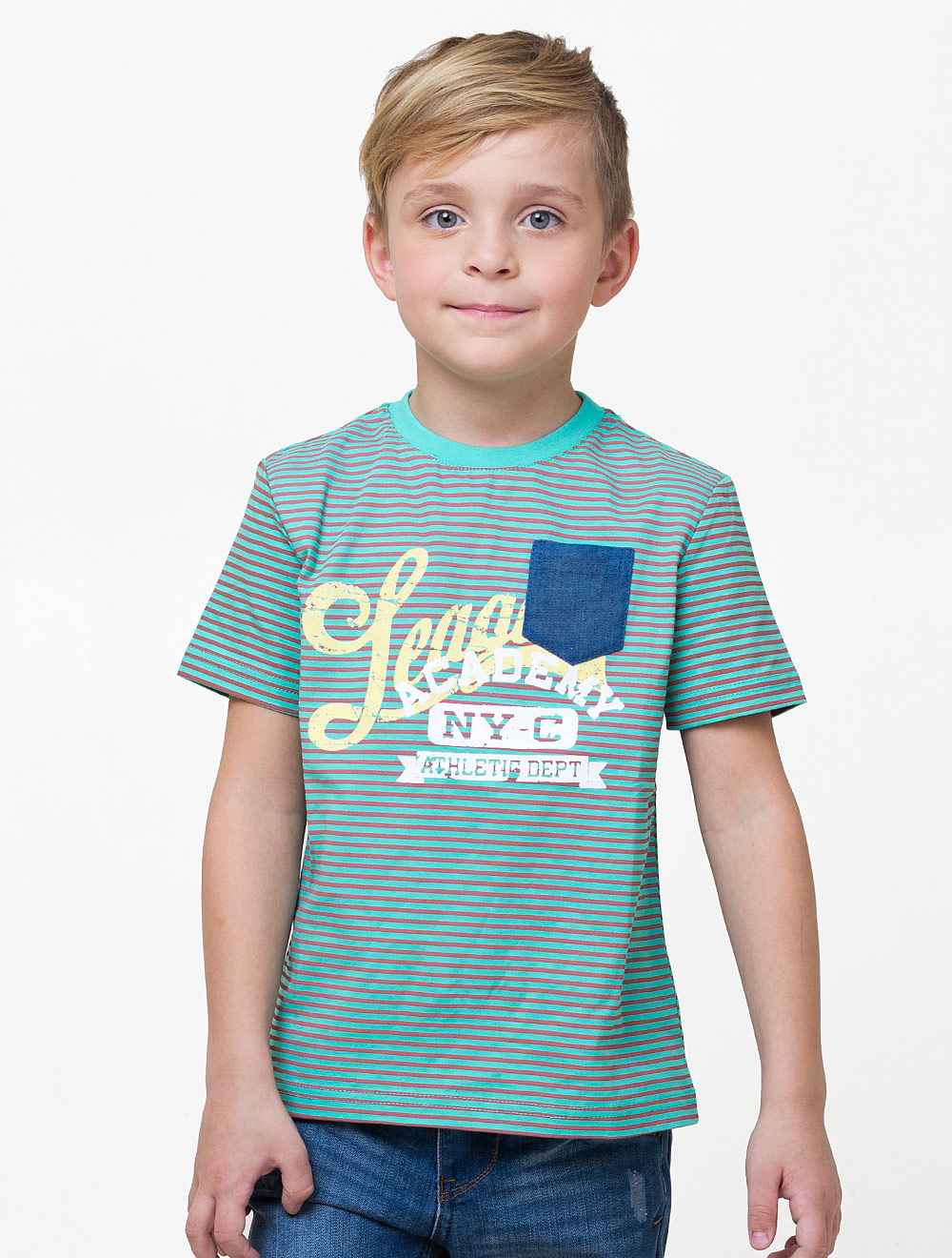 Описание: Футболка для мальчика из хлопкового полотна, декорирована принтом. На груди джинсовый декоративный карман.