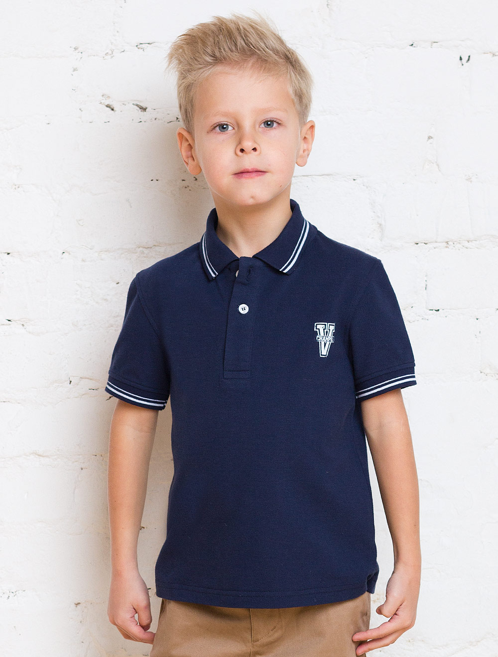 Описание: Рубашка-поло для мальчика из ткани "пике". Манжеты и воротник с контрастной полоской выполнены из плотного вязаного трикотажа. На груди принт.