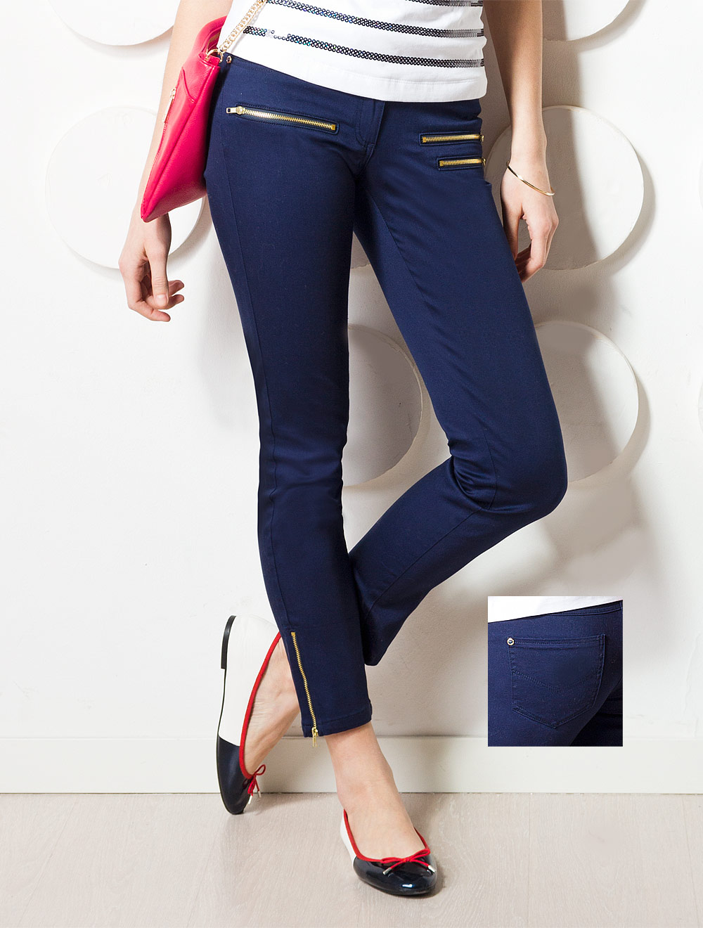 Описание: Эластичное плотное хлопковое полотно с сатиновым переплетением. Декоративные джинсовые отстрочки в тон изделия. Передняя часть и низ брюк украшены металлическими молниями золотистого цвета.