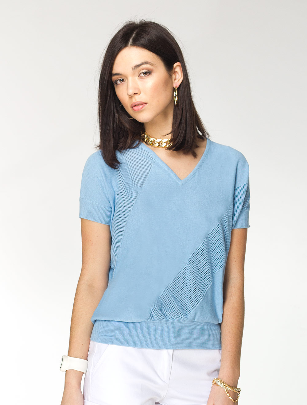 Описание: Тонкая хлопковая вязка. Косые широкие полосы по передней части изделия выполнены за счет разной фактуры вязки. Цельнокройный рукав внизу собран на рибану. Свободный трапецевидный силуэт с эффектом проймы "летучая мышь".