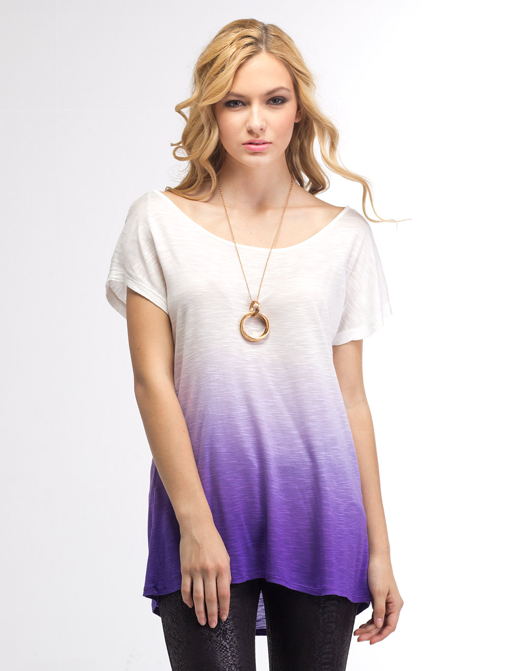 Описание: Тонкое трикотажное и полупрозрачное полотно с уплотнениями нитей в плетении.Свободный силуэт удлиненный сзади. Широкий вырез горловины и цельнокройный рукав. Главный эффект изделия в цветовом градиенте ткани.