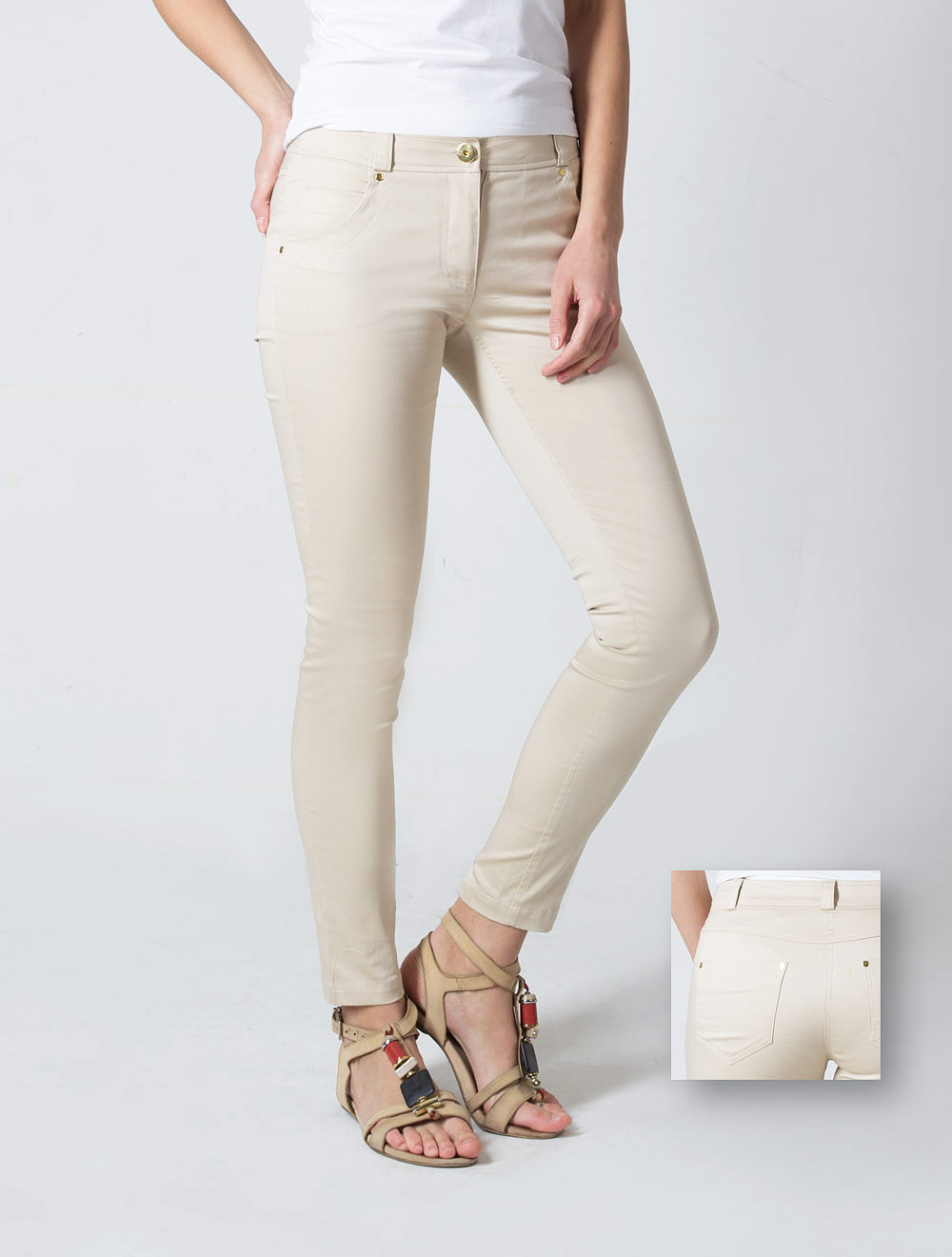 Описание: Хлопок с эластаном сатинового переплетения. Брюки стандартного "джисового" силуэта. Внизу сзади брюки имеют декоративный вырез, украшенный золотистой заклепкой.