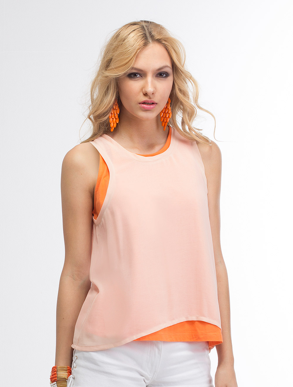 Описание: Изделие состоит из двух отдельных частей. Хлопковый трикотажный топ внизу яркого оттенка и полупрозрачный топ из полиэстера с эффектом "жатки" более светлого оттенка.